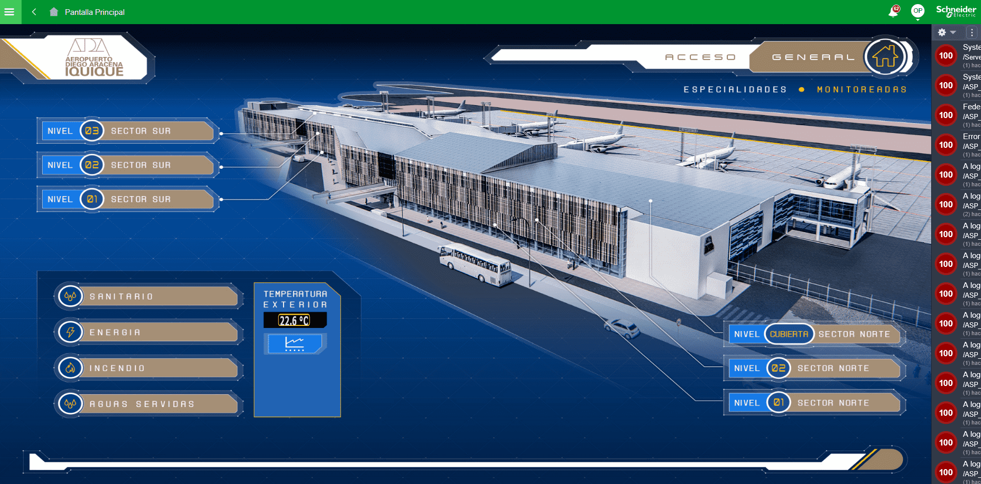 Control de iluminación, Estados de funcionamiento de los puentes de embarque, Control de Climatización, Medición de energía, Estados de funcionamiento de ascensores, escaleras mecánicas, Entre otros.